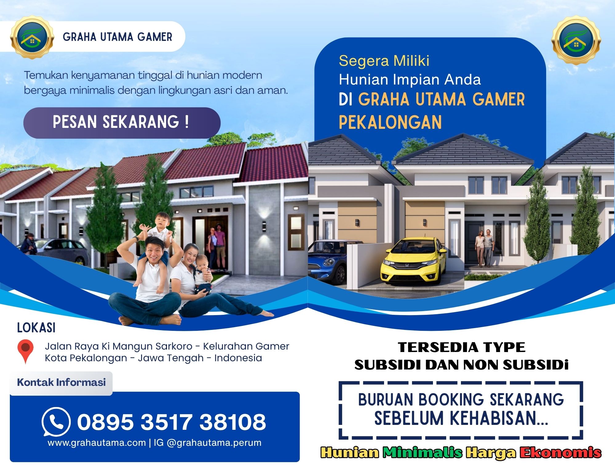 Perumahan subsidi dan non subsidi Graha Utama Gamer Kota Pekalongan adalah sebuah proyek perumahan subsidi tipe bangunan 30 dengan luas tanah 60 m2, non subsidi tipe bangunan 36 dengan luas tanah 72 m2 dan non subsidi tipe bangunan 45 dengan luas tanah 84 m2. Lokasi strategis daerah perkotaan dekat dengan keramaian, pasar, tempat Pendidikan SD-SMP-SMA/SMK.
